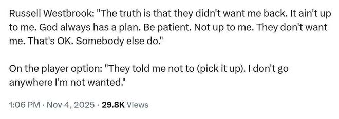 一直有人好奇威少今夏休赛期怎么会拒绝执行25-26赛季价值347万美元的球员选项离开掘金,跑到没有争冠希望的国王还只能拿无保障底薪,这番操作的确让人摸不着头脑。