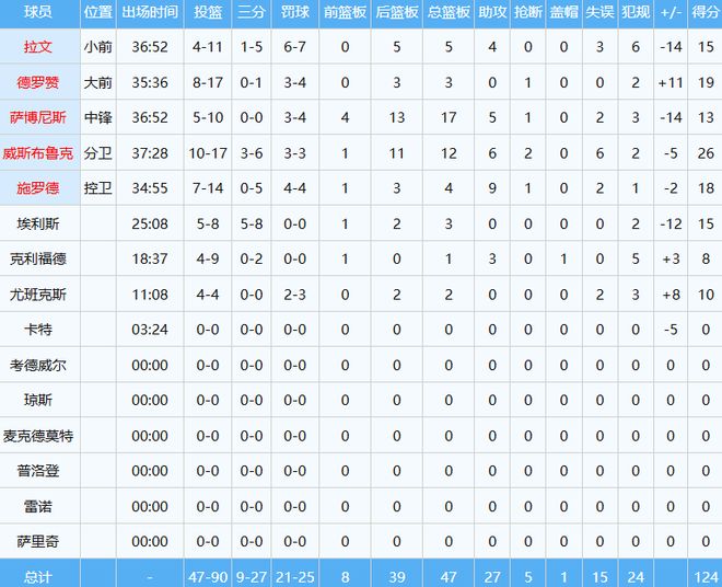 国王124-130不敌掘金,此役威少以首发大前锋身份出战,面对老东家打出本赛季最强一战,约37分钟时间里,投篮17中10,其中三分球6中3,罚球3中3砍下26分12板6助2断炸裂数据。